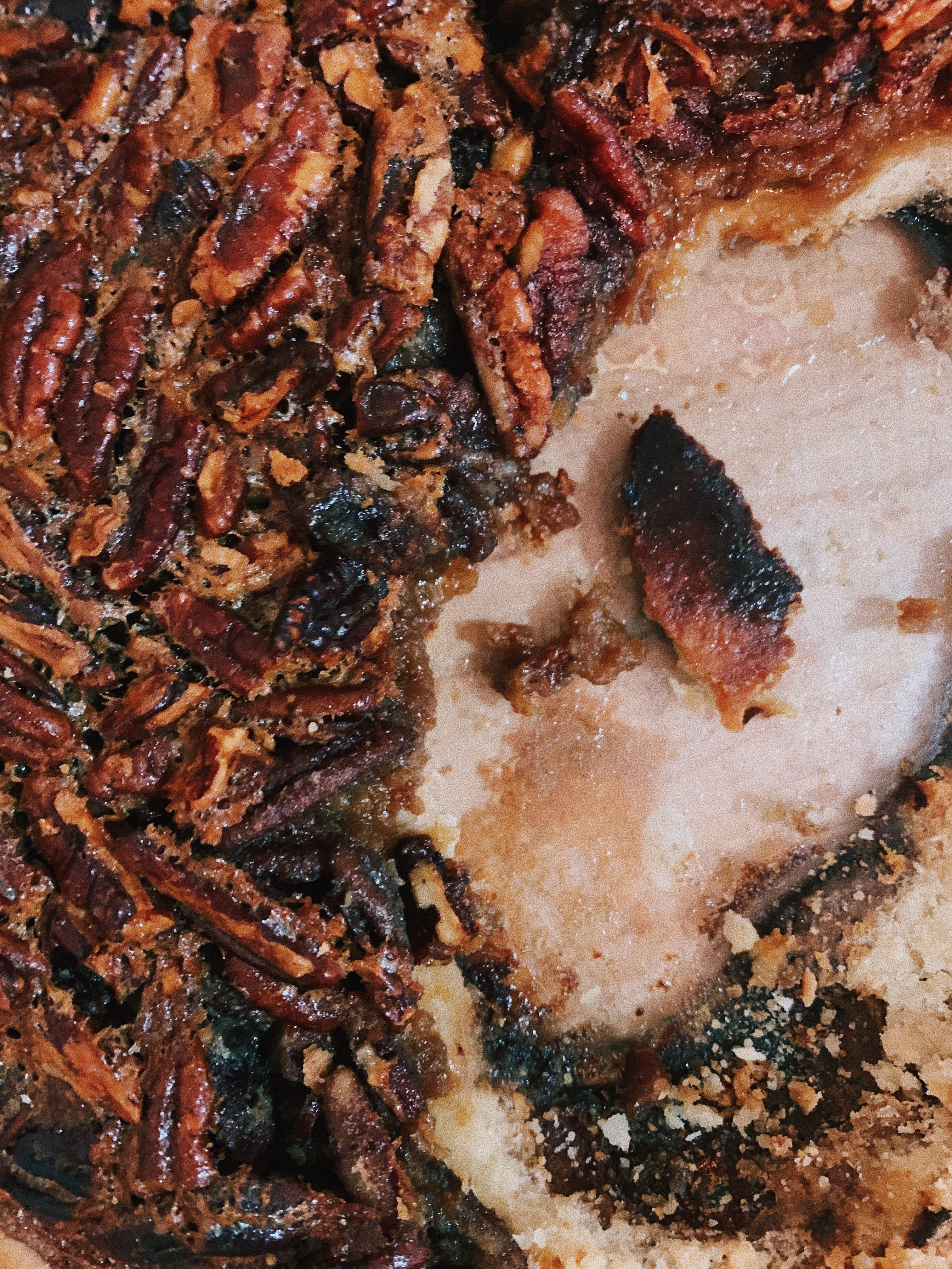Despite its flimsy structure, the pie had a longevity beyond what I expected. Its life began Monday afternoon, when Maya, bereft of her own ability to make pie due to NYC landlord incompetence, chopped pecans and I pulsed flour, sugar, and butter for the crust in a food processor. It was born later that evening unto Emma, who needed somewhere to go that wasn’t home with her thoughts. We sat on the floor of my living room because I still haven’t bought a table for my apartment and spooned the gloop into our mouths with a side of ice cream as Spotify cycled through the “Women Of Folk” playlist it (correctly) suggested to us. Two days later, my boyfriend and I each ate another slice (a loose interpretation of the word) while standing upright in my kitchen. I was grumpy after commuting in the rain and spending too much of my day on the phone with my insurance, but got through it knowing there was a treat to come home to. A couple more servings remain, sitting in the plastic-wrapped dish on my kitchen island. My sister has a friend visiting this weekend, and I’m sure the two of them will help finish the leftovers. What a nice life for a pie to have that’s just a few short days making many people happy in the different ways they needed it.